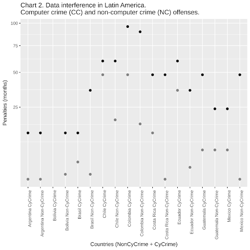 Other countries have a more balanced approach. Argentina, for instance, punishes cyber and non-cyber offenses in the same way, with cyber and non-cyber offenses in the same section of the Criminal Code. In that sense, Article 153 and Article 153 bis punishes illegal access to private communications, whether communications are electronic (telephone, computers, and so on) or not (traditional mail).68 On the other hand, Article 183 covers damages for both material and electronic goods, and establishes the same penalty for both offenses.69 We also find a balanced approach when we look at specific crimes. For instance, when considering damages produced through data interference crimes and damages produced when other kind of property is affected, scales seem to be quite similar, with occasional outliers. Costa Rica, Ecuador, Colombia, Chile and Guatemala, for instance, punish cyber-offenses in a slightly harsher way (see Chart 2). The grey dots show the minimum penalty for data interference in Latin America and the black dots show the maximum penalty for the same crime.