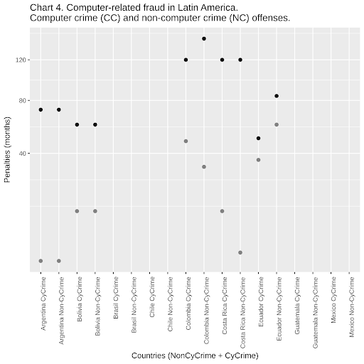 78. The grey dots show the minimum penalty for computer-related fraud in Latin America and the black dots show the maximum penalty for the same crime.