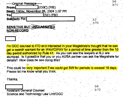 The FBI has been using the tool in domestic criminal investigations as well as in FISA cases,7 and the FISA Court appears to have questioned the propriety of the tool.8 Other agencies, and even other countries have shown interest in the tool, indicating its effectiveness. Emails from 2006 discuss interest from the Air Force,9 the Naval Criminal Investigative Service10 and the Joint Task Force-Global Network Operations,11 while another email from 2007 discusses interest from the German government.12