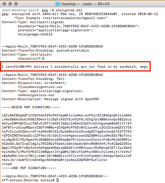 6.Type “gpg -d encrypted.eml”. (Note, if you named your file something else, you can swap it with the “encrypted.eml” text. Be mindful of capitalization and spelling!)