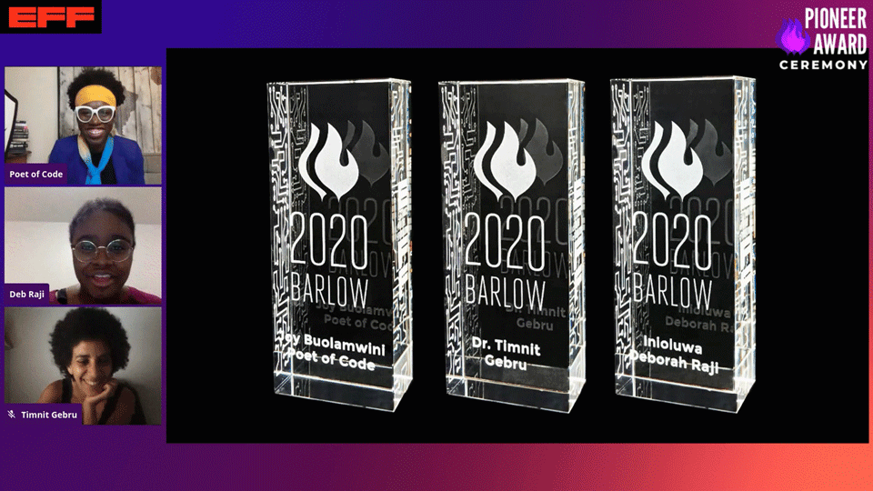 Following this stunning video, EFF’s Director of Community Organizing, Nathan Sheard, introduced the final award winners—Joy Buolamwini, Dr. Timnit Gebru, and Deborah Raji.
