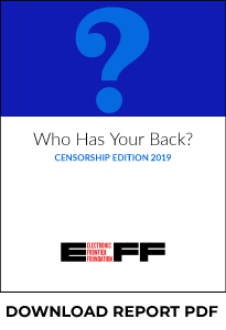 Nate Cardozo, Andrew Crocker, Gennie Gebhart, Jennifer Lynch, Kurt Opsahl, and Jillian C. York, “Who Has Your Back? Censorship Edition 2018,” Electronic Frontier Foundation, https://www.eff.org/who-has-your-back-2018. ↩